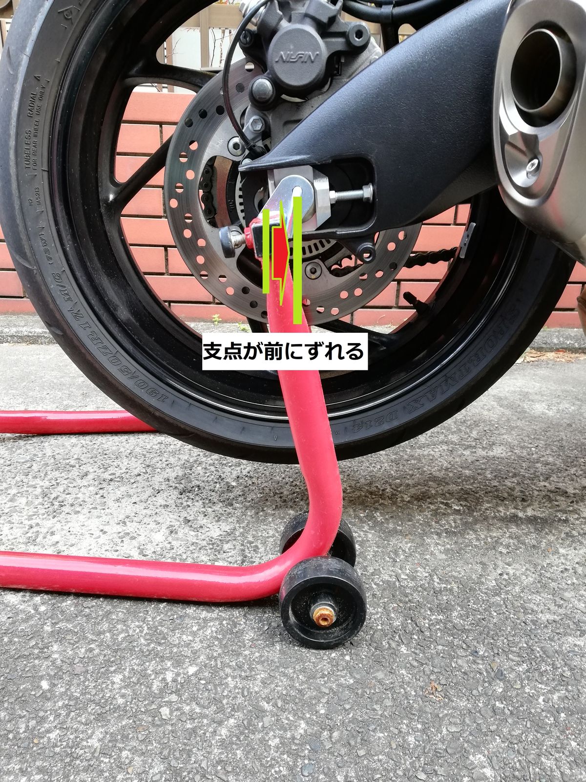 使ってみた感想ですが、マニュアル通りにフロントのブレーキをかけた状態で、リアを持ち上げるのがちょっとコツがいりますね。腰痛持ちには厳しいです。が、一人でスタンドをかけられるのは画期的。