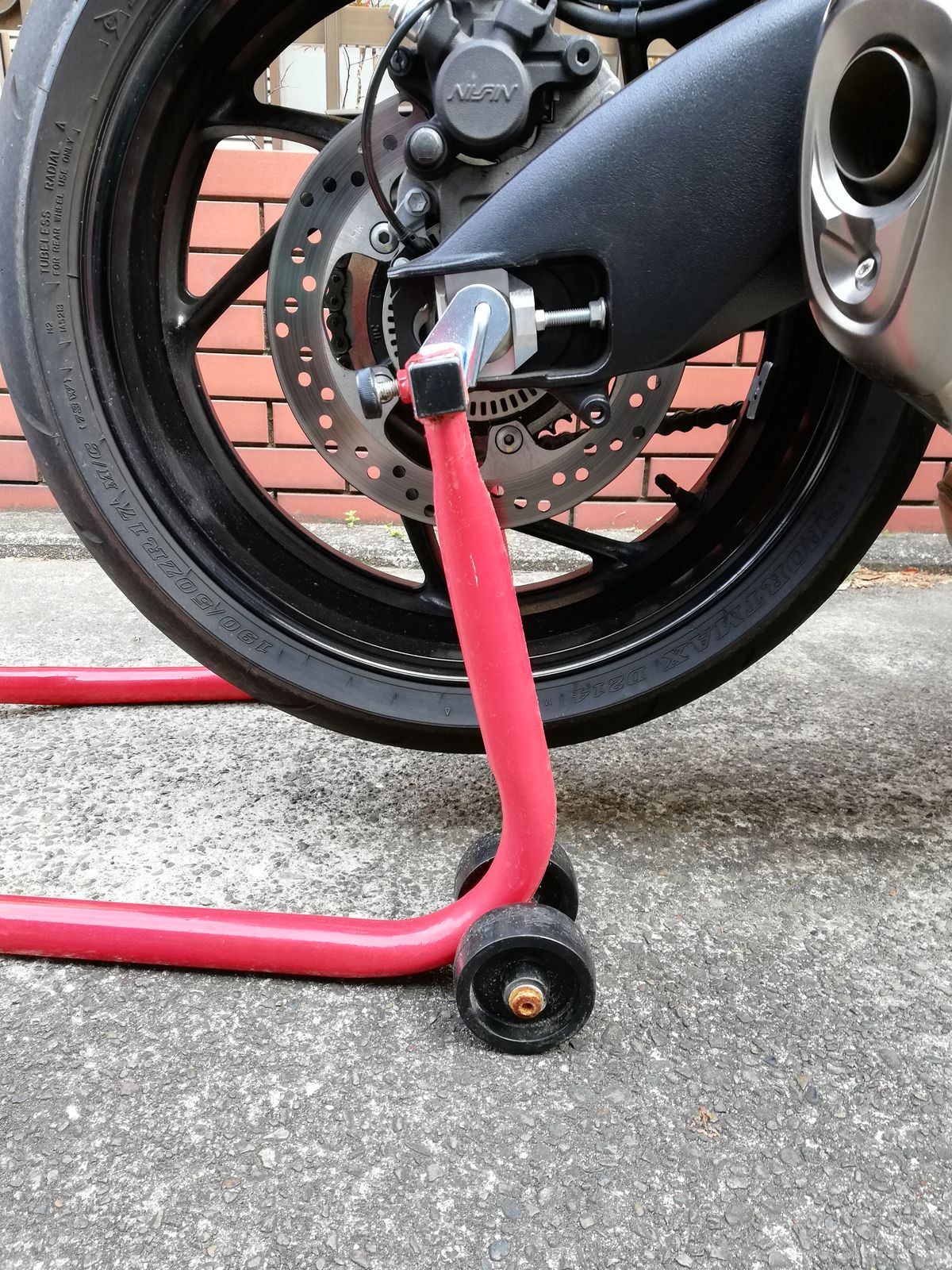 Ninja400のときはメンテナンススタンドにL型のものを使っていたのですが、GSX-S1000Fは左側のアクスルナットが邪魔をして、L型がはまりません。