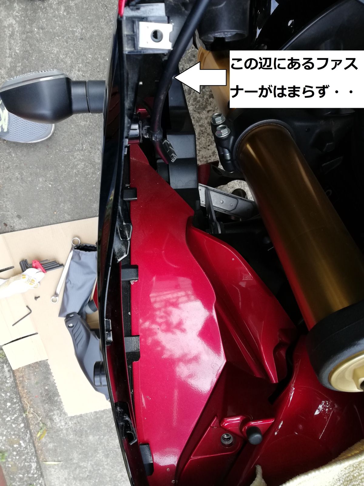 穴にファスナーを突っ込んでも、ささらない。カウルのはめ方がどこか間違ってますかね?それとも3個あったファスナーを取り違えているとか?