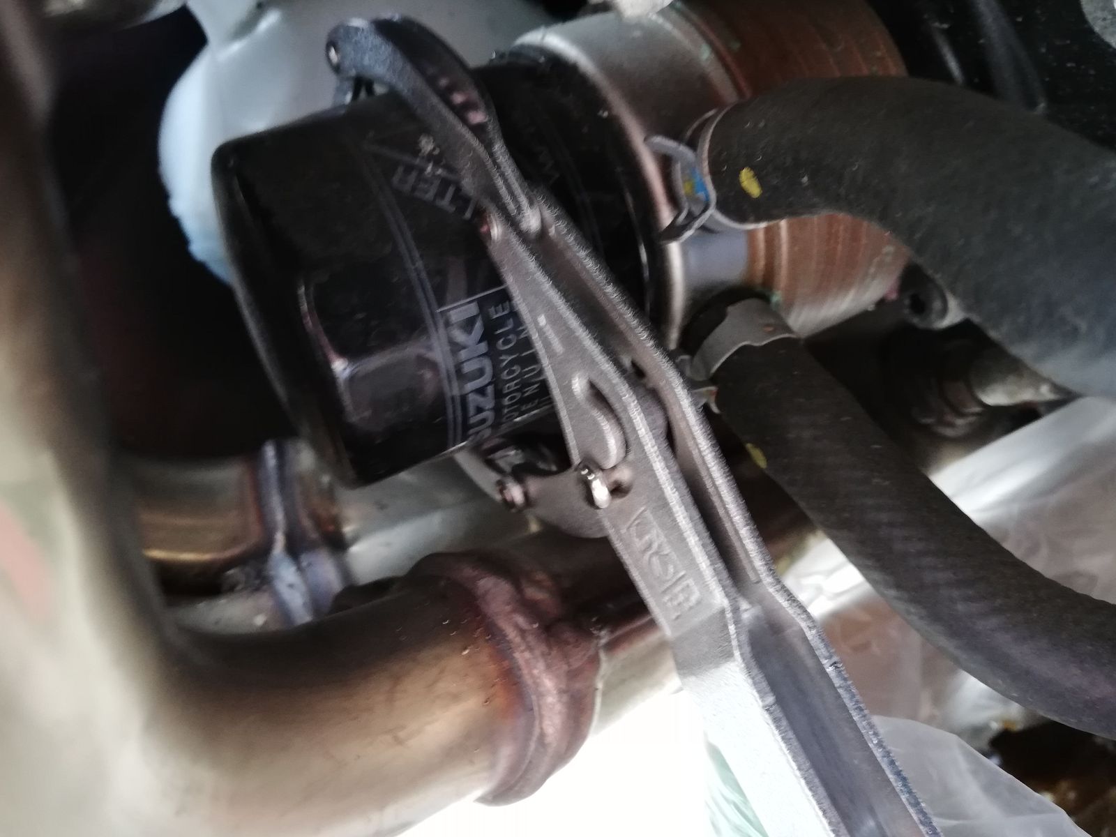 さらに、フィルターが手でも回るようになってから、車体から外れるまでも以外と大変。このフィルターレンチだと、手で回した方が簡単ではあるのですが、オイルで滑ることと手が届きにくいことから、いつまで回したら外れるのか、またまた泣きそうになり。