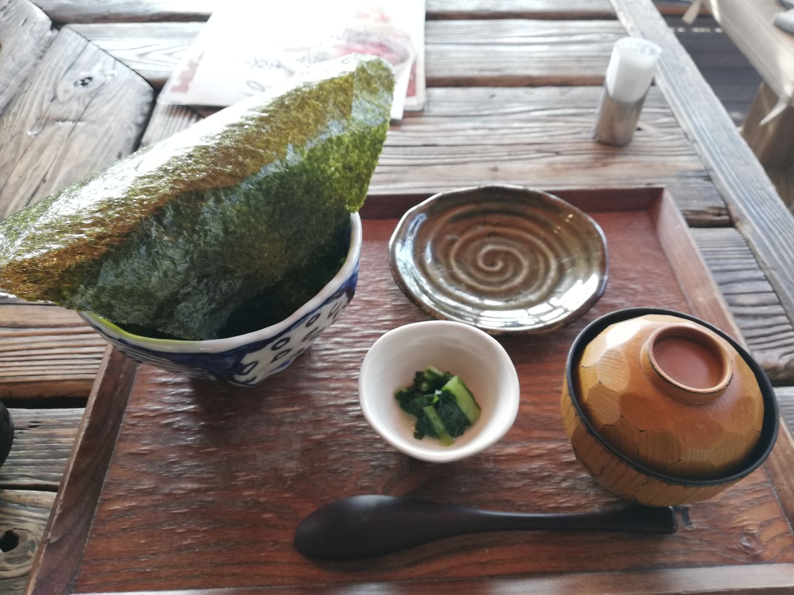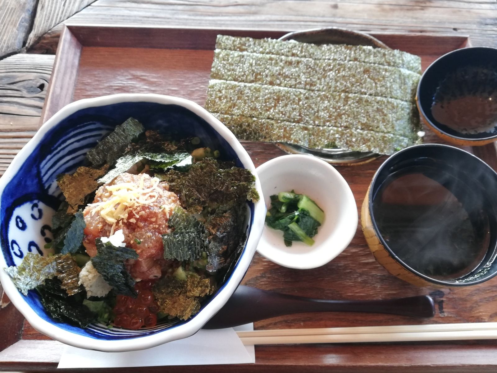 海苔の下はなめろうです。お椀の中身はだし汁で、最後にご飯を少し残して出汁茶漬けにするのがお薦めだそうです。海苔は手巻きにしても、散らしても、という話だったので、半分に切って両方やりました。