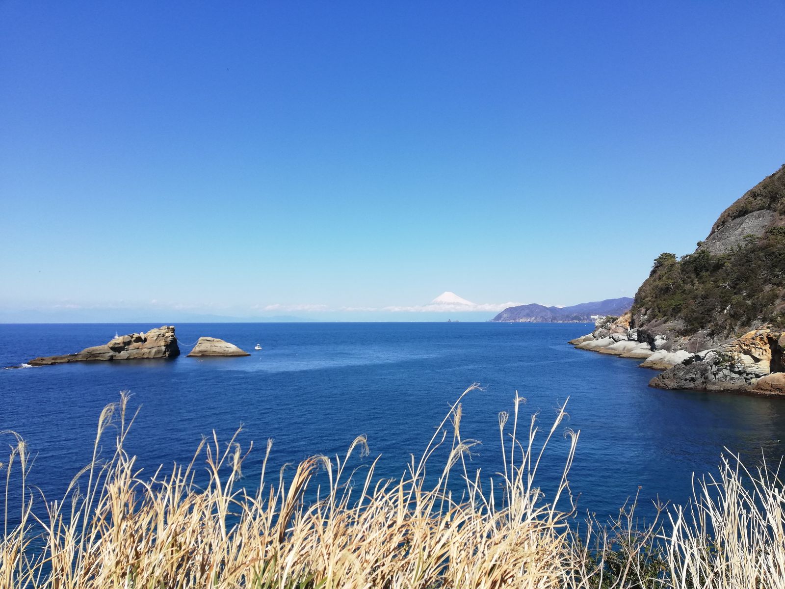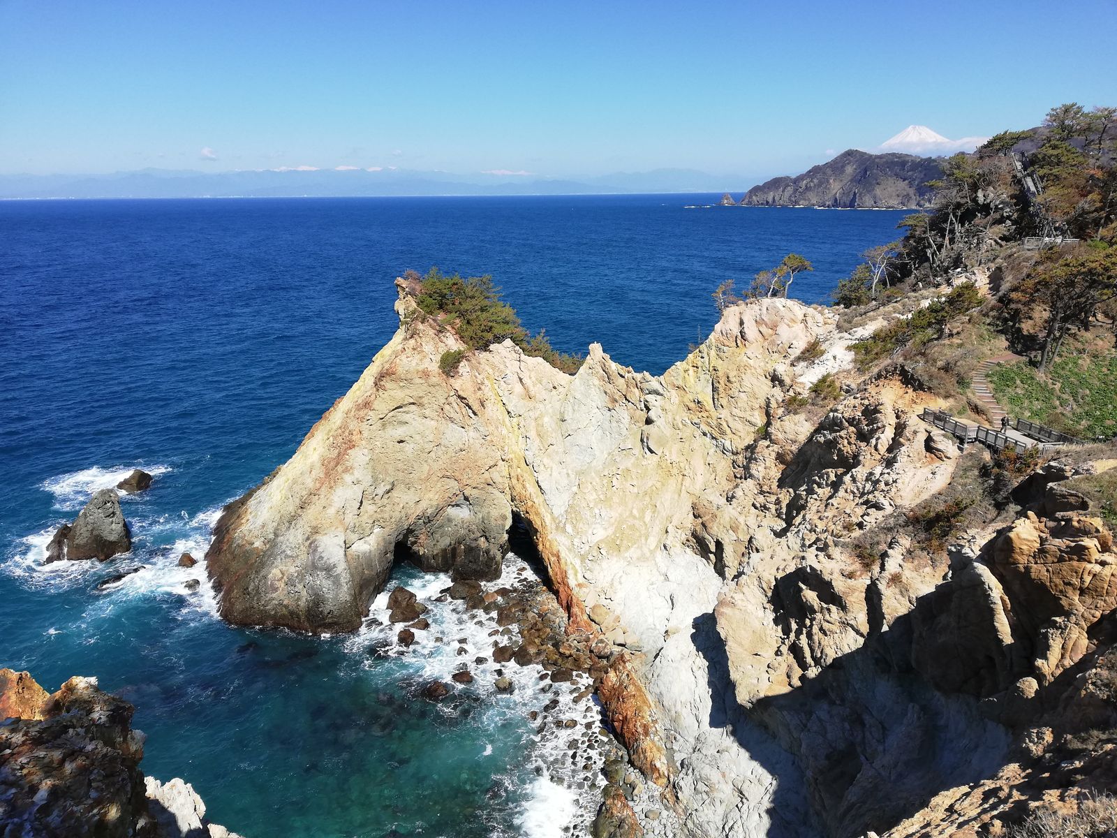 面白い岩ときれいな海と、向こうの方には富士山が。