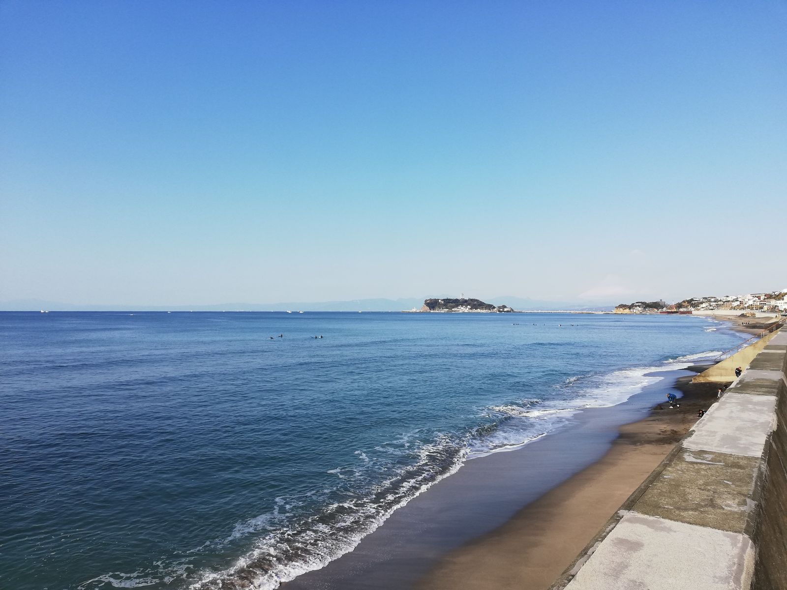 真ん中が江ノ島。その右側にうっすらと富士山が写っているような・・・。