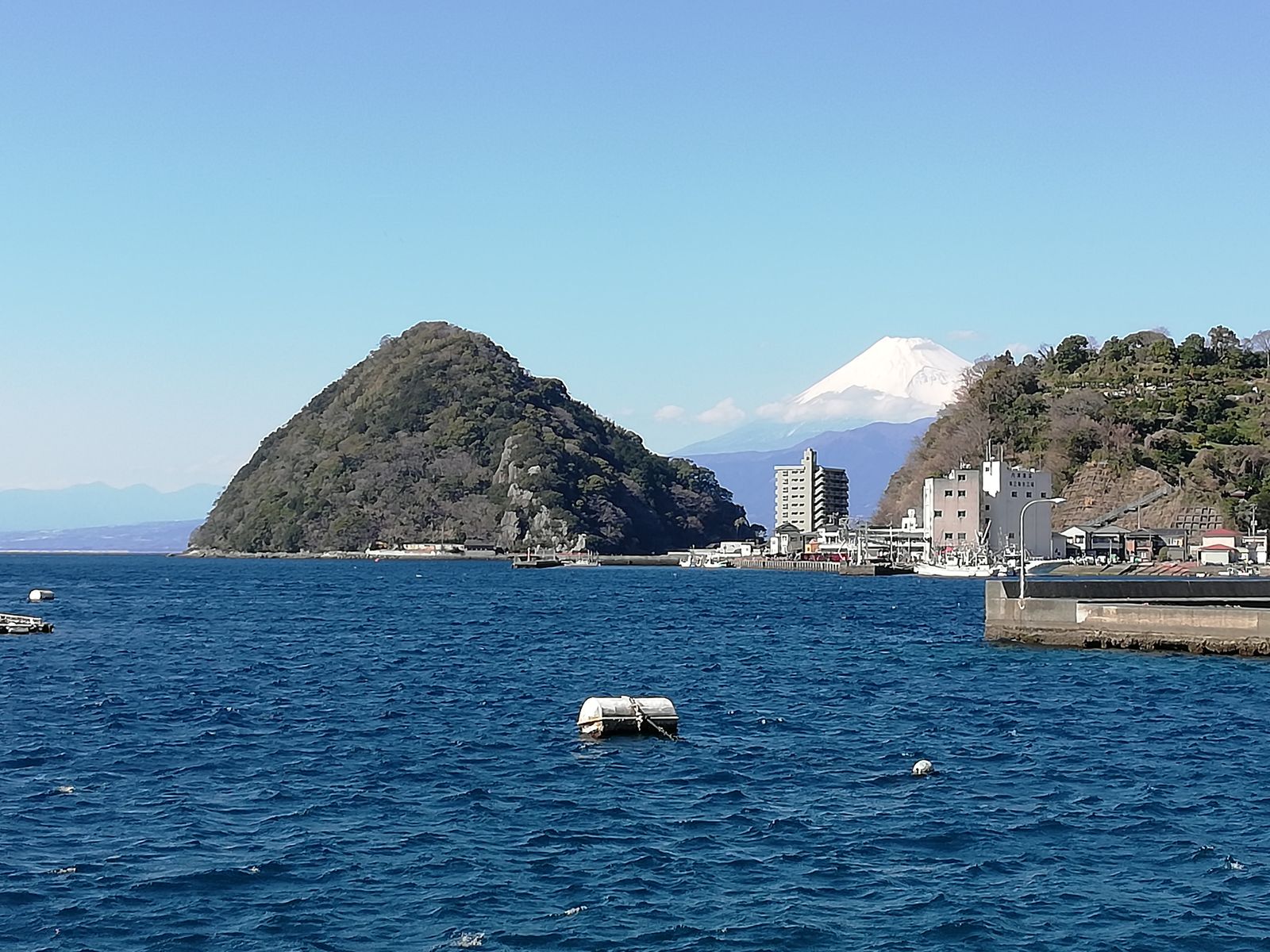 この時間はお店の裏の釣り客が少なかったので、海を見ながら。雲もなくなってきて、淡島と富士山もはっきり見えてます。