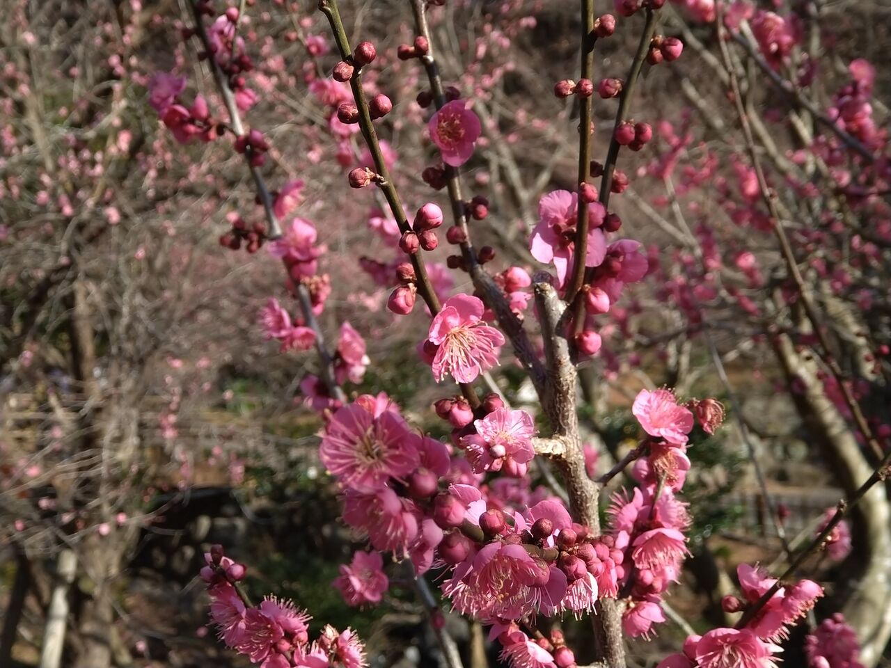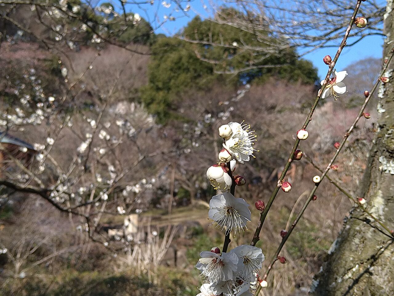 いろいろな種類の梅が咲いており、遠目にみると全体がうっすらと白~ピンク色。